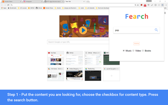 Fearch adalah ekstensi Firefox yang dirancang untuk membantu pengguna melakukan pencarian konten secara efisien. Dengan fitur pencarian yang memungkinkan pengguna menemukan file di server, ekstensi ini mendukung berbagai jenis konten, termasuk musik, video, dan buku. Proses pencarian dimulai dengan memasukkan nama konten yang diinginkan, diikuti dengan pemilihan jenis konten menggunakan kotak centang. Pengguna dapat mencari lebih dari satu jenis konten sekaligus, memberikan fleksibilitas dalam pencarian.